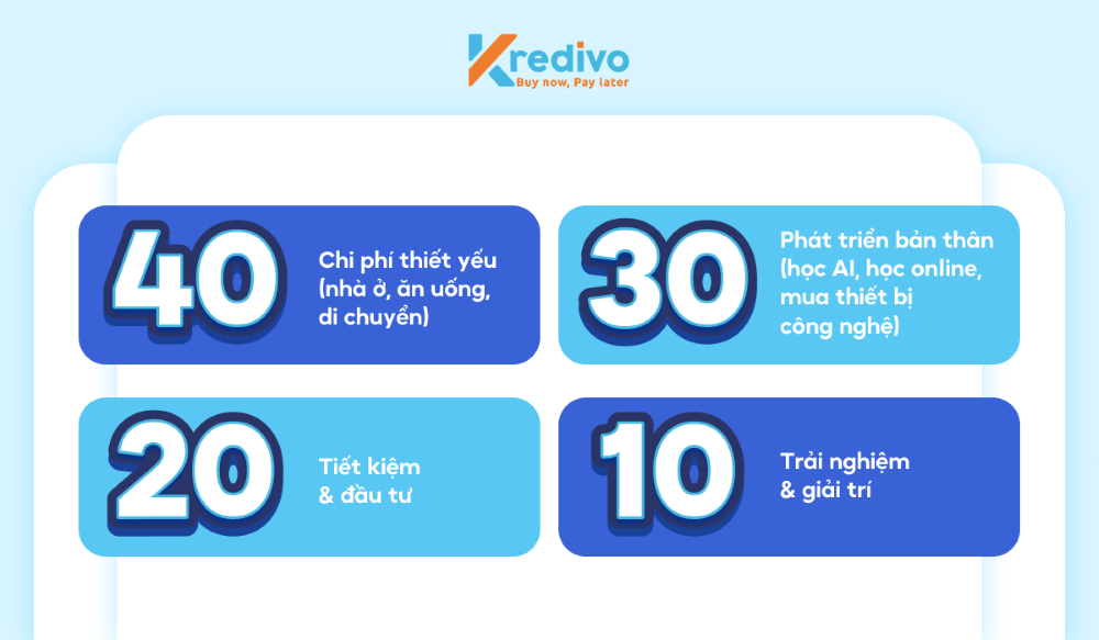 - 40%: Chi phí thiết yếu (nhà ở, ăn uống, di chuyển)